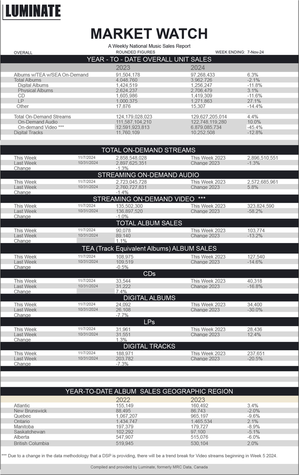 Voici le rapport Luminate Data Market Watch de cette semaine qui présente les statistiques de la musique canadienne pour la semaine en cours et depuis le début de l'année avec des comparaisons avec l'année dernière. Ce graphique est publié tous les mardis. L'abréviation « TEA » est un terme utilisé pour décrire la vente de téléchargements de musique ou de singles. Un album équivalent à une piste équivaut à 10 pistes, soit 10 chansons.