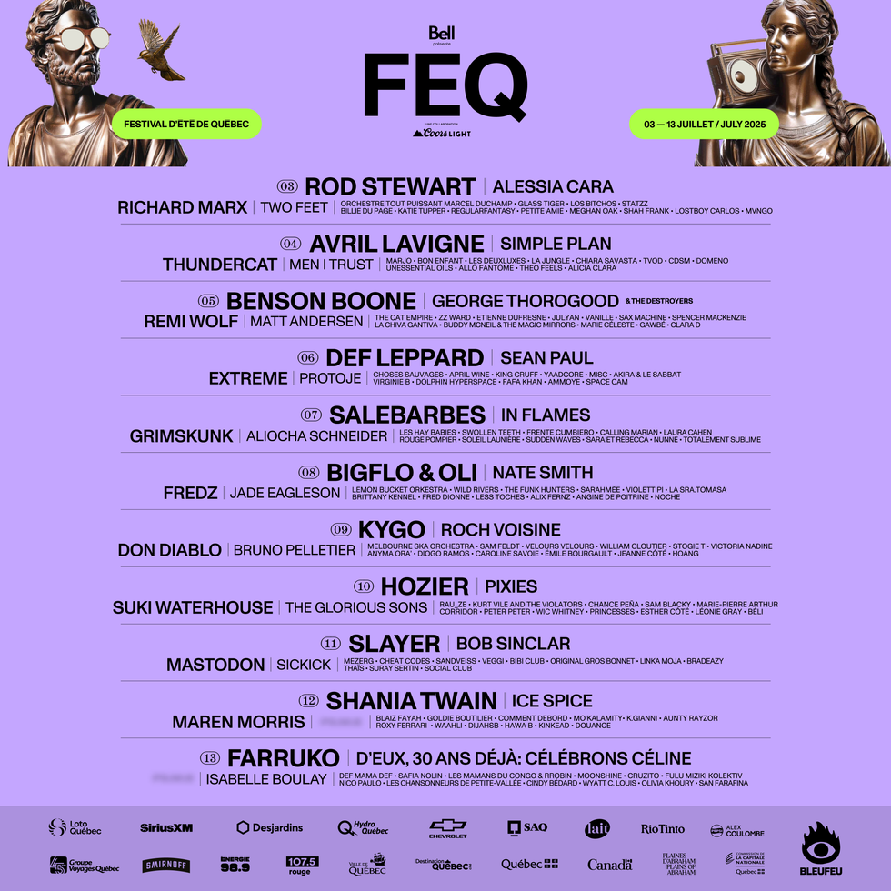 Shania Twain et Avril Lavigne seront les têtes d'affiche de ce festival de 11 jours, qui se tient à Québec depuis plus de 50 ans. Parmi les autres artistes majeurs, on retrouvera Benson Boone, l’auteur-compositeur-interprète irlandais Hozier, les légendes du thrash metal Slayer, ainsi que la superstar historique Rod Stewart.