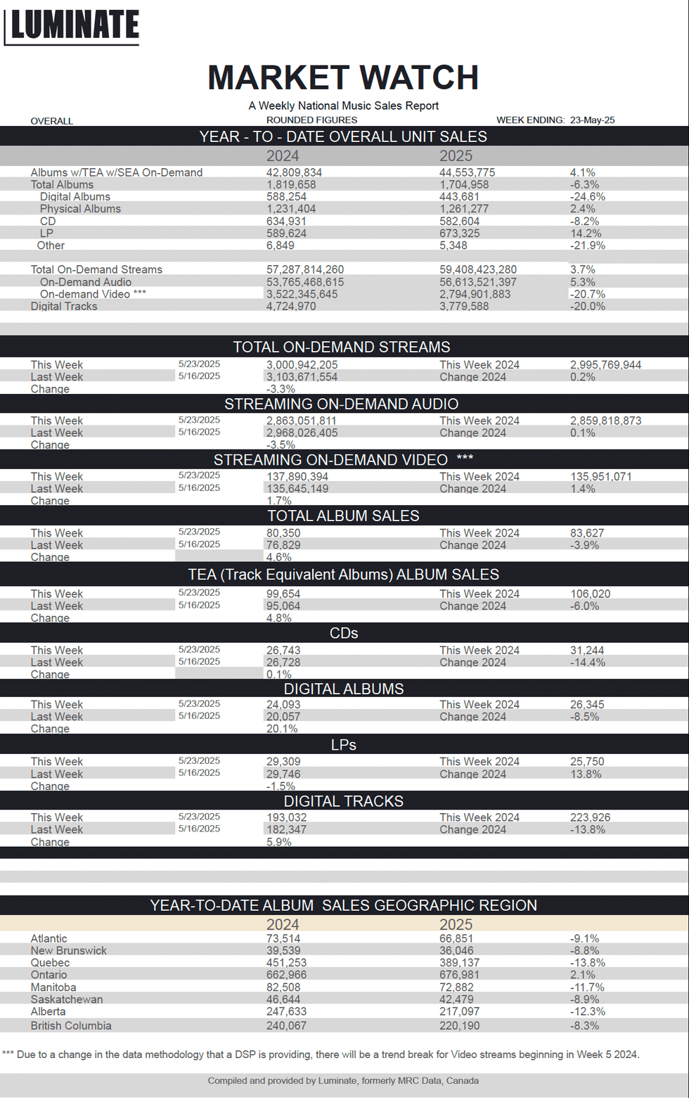 Here is this week's Luminate Data Market Watch national sales report, featuring stats for Canadian album sales, streams, digital sales and more.