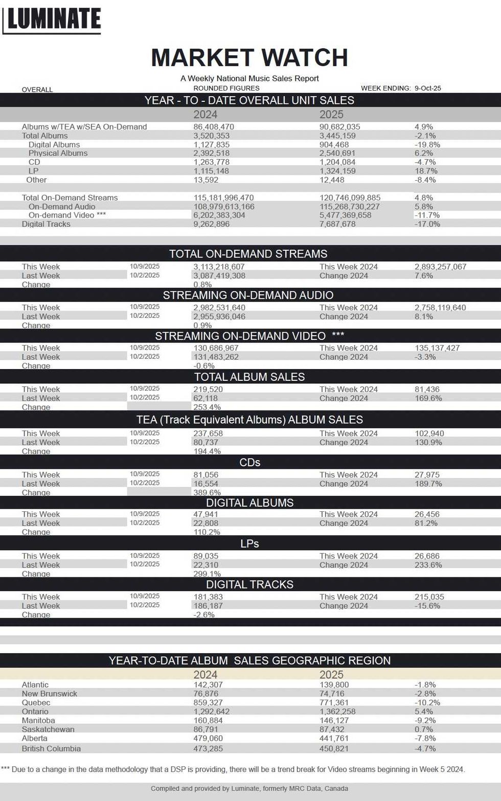 Here is this week's Luminate Data Market Watch national sales report, featuring stats for Canadian album sales, streams, digital sales and more.
