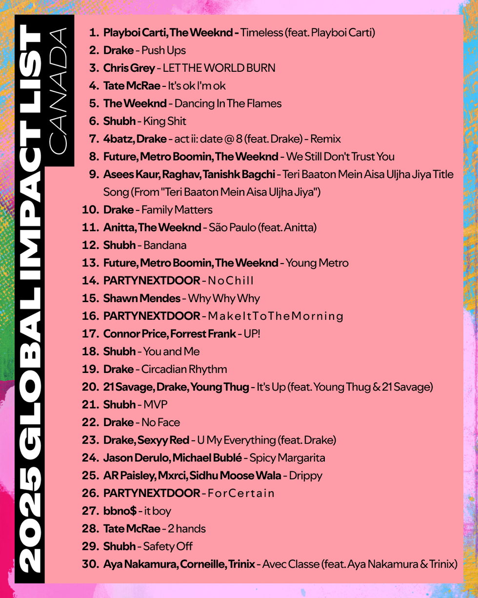 Spotify has just announced its first-ever Global Impact List for Canada. This list highlights artists whose songs were in heavy rotation among listeners outside their own countries during the last six months. To nobody's surprise, Drake and The Weeknd are each featured on three of the Top 10 each, while rising global star Tate McRae makes the list with "It’s OK I’m OK" at No. 4.