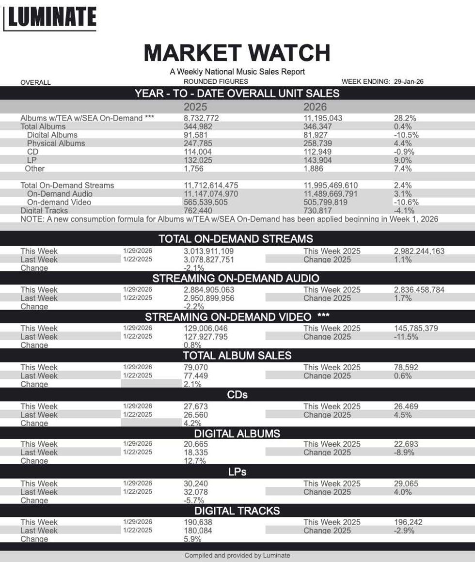 Here is this week's Luminate Data Market Watch report which features Canadian music stats for the current week and YTD with comparisons to last year. This chart is published every Tuesday. The abbreviation "TEA" is a term used to describe the sale of music downloads or singles. A track equivalent album is equal to 10 tracks, or 10 songs.