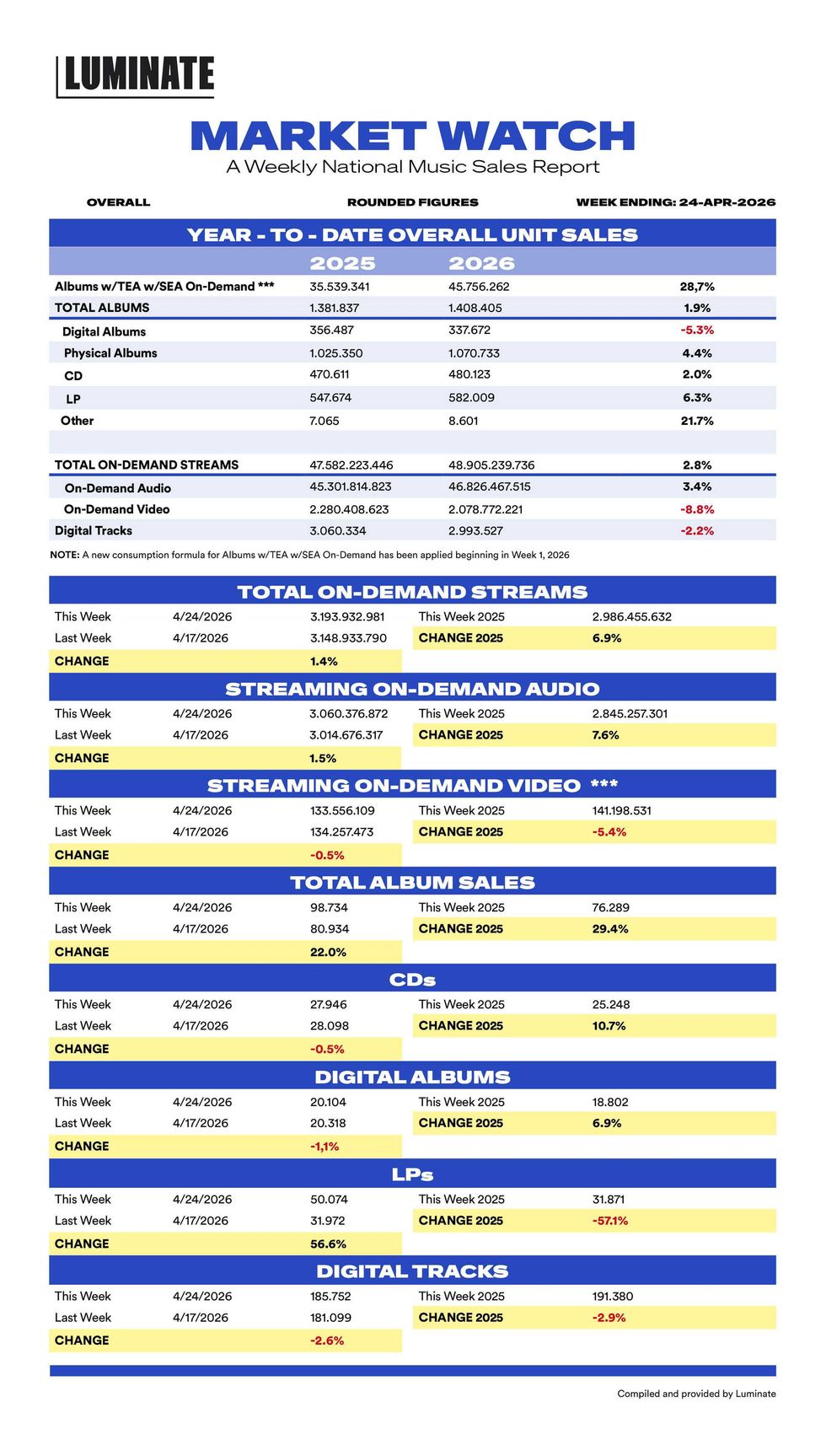 Here is this week's Luminate Data Market Watch national sales report, featuring stats for Canadian album sales, streams, digital sales and more.