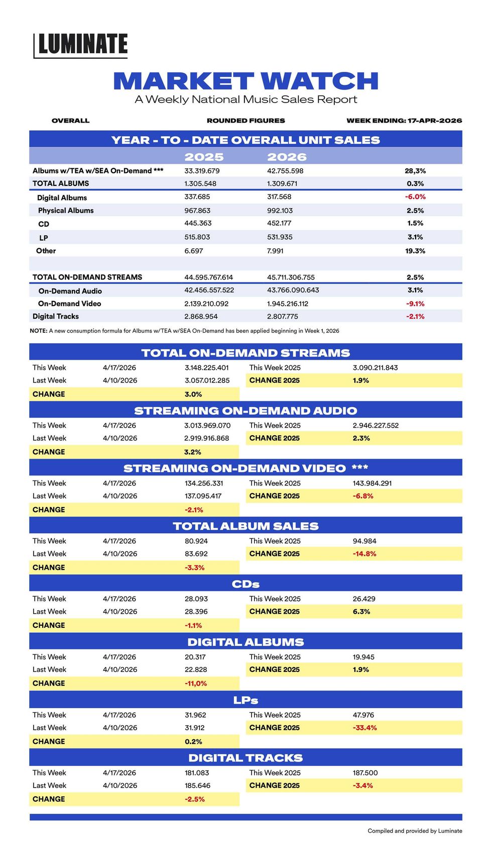 Here is this week's Luminate Data Market Watch report which features Canadian music stats for the current week and YTD with comparisons to last year. This chart is published every Tuesday. The abbreviation "TEA" is a term used to describe the sale of music downloads or singles. A track equivalent album is equal to 10 tracks, or 10 songs.