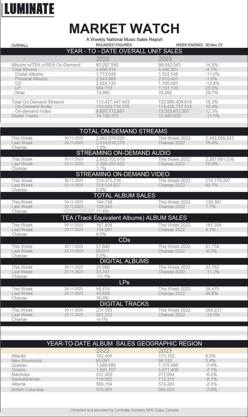 Here is this week's Luminate Data Market Watch report which features Canadian music stats for the current week and year-to-date comparisons to last year.