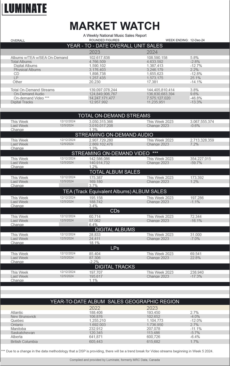 Here is this week's Luminate Data Market Watch report which features Canadian music stats for the current week and year-to-date comparisons to last year.