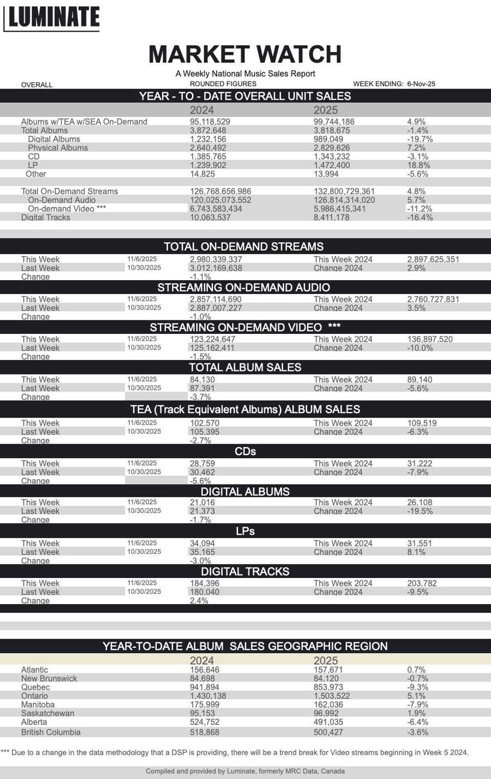 Here is this week's Luminate Data Market Watch national sales report, featuring stats for Canadian album sales, streams, digital sales and more.