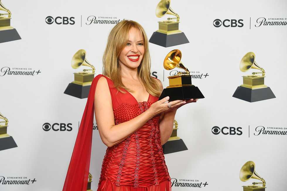 Kylie Minogue, winner of the best pop dance recording award for “Padam Padam,” poses in the press room during the 66th annual Grammy Awards at Crypto.com Arena on Feb. 4 in Los Angeles.