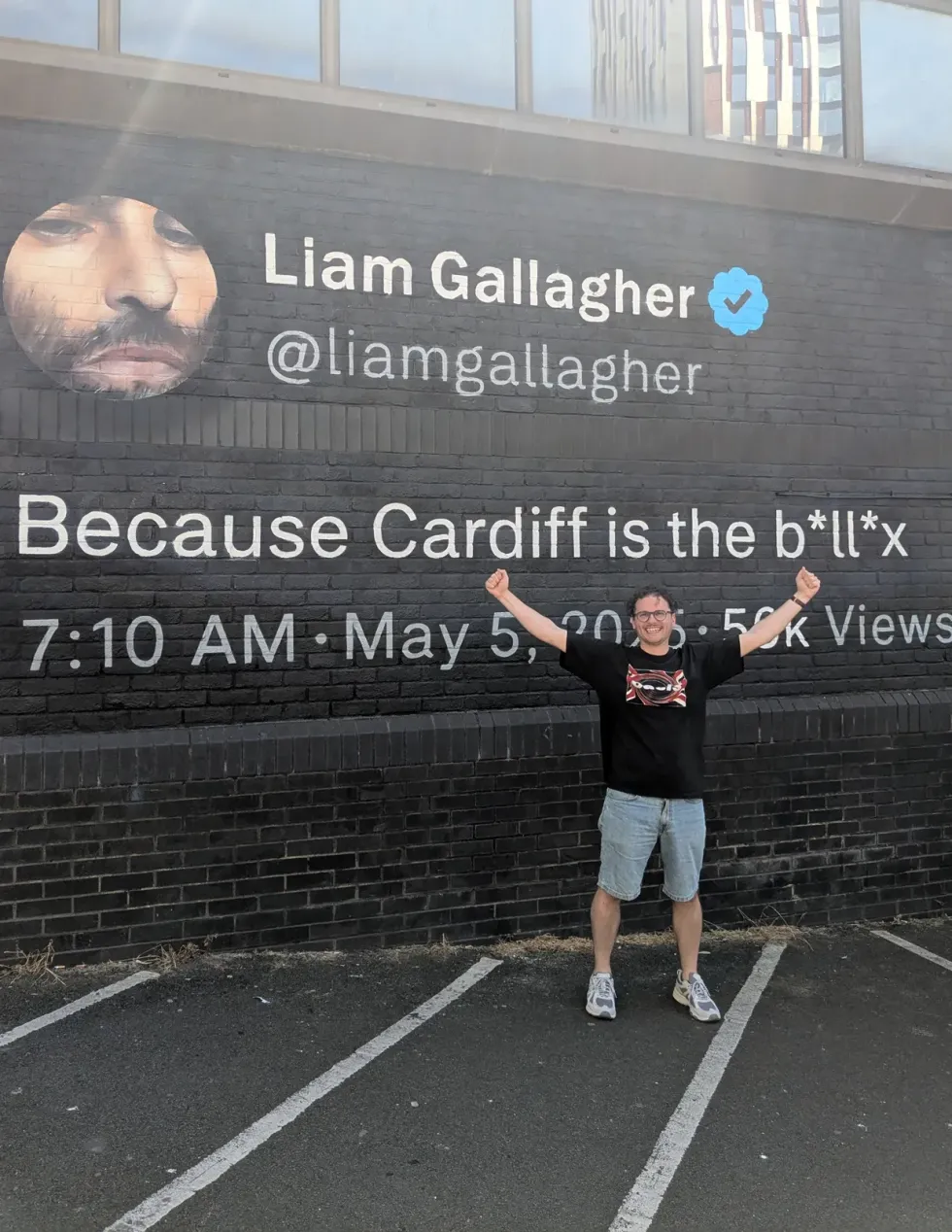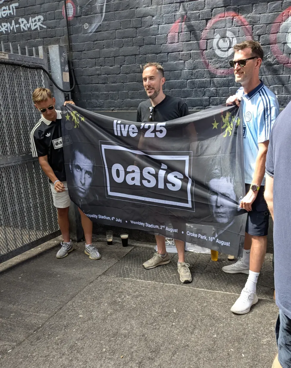 The streets were appropriately filled with DIY merchandise, with punters using the brothers’ iconography and claiming it for their own purpose. At a pre-party at beloved haunt Clwb Ifor Bach, a group of lads unfurl a personalized flag that features the band’s logo, their image, and the three shows they’ll be heading to on the Live ‘25 run: Cardiff, London, Dublin. A convenience store prints off a life-size cut-out of Liam, but they’ve plumped for a less-than iconic shot of the frontman. He looks like he’s putting his bins out for collection, rather than posing as the irresistibly cool ringleader of the world’s best band.
