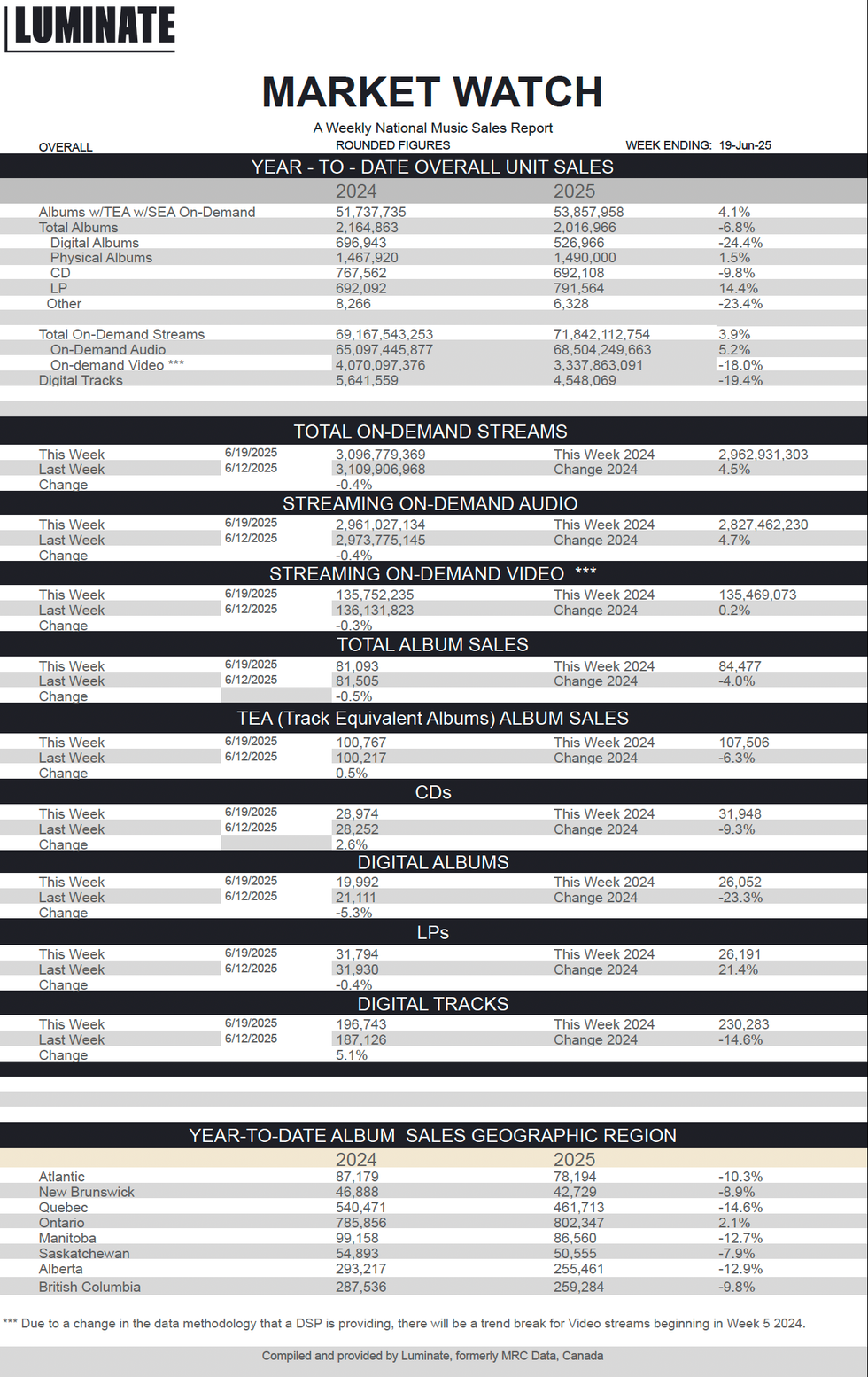 Voici le rapport national hebdomadaire de Luminate Data Market Watch, avec les dernières statistiques sur les ventes d’albums canadiens, les écoutes en streaming, les ventes numériques et bien plus encore.