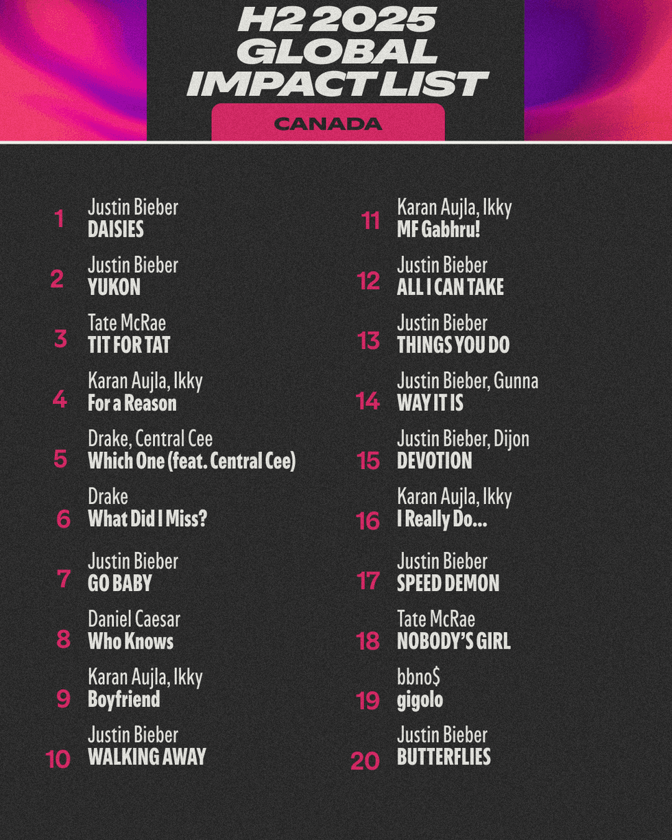 “This list proves that Canadian music doesn’t just travel — it sets the tone worldwide. We’ve got everything here from Punjabi-Canadian artists to huge pop records, and that mix is exactly what makes the Canadian scene so exciting right now,” says Elizabeth Phipps, artist and label partnerships lead at Spotify Canada.