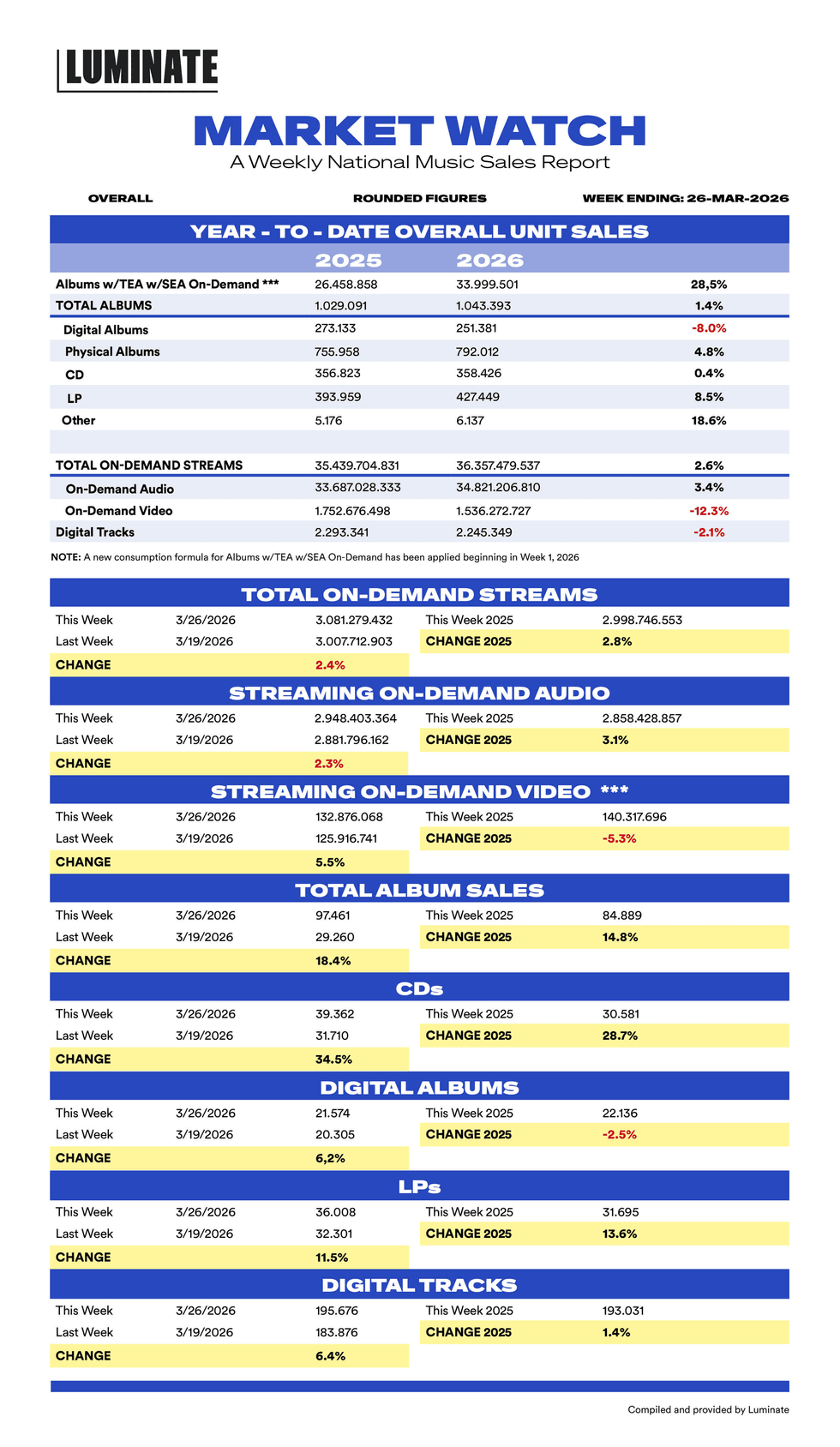Here is this week's Luminate Data Market Watch report which features Canadian music stats for the current week and YTD with comparisons to last year. This chart is published every Tuesday. The abbreviation "TEA" is a term used to describe the sale of music downloads or singles. A track equivalent album is equal to 10 tracks, or 10 songs.